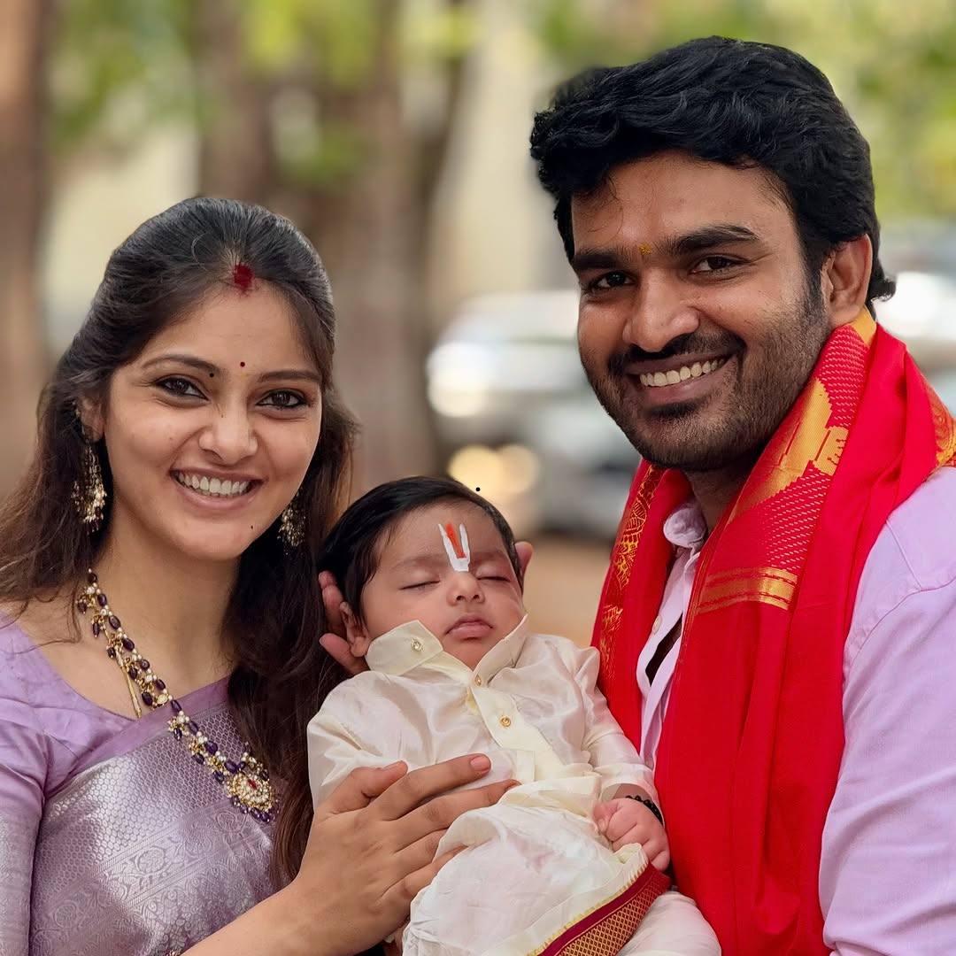 The post featured two heartwarming photos—one showing the proud parents beaming with joy while holding baby Hanu, and another capturing the little one peacefully smiling in his sleep. Kiran captioned it, “Koduku Peru ‘Hanu Abbavaram’. With the blessings of Lord Hanuman and Venkateshwara Swamy, we named our son at Tirumala today.”